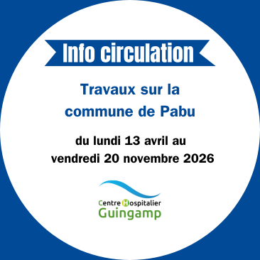 Accueil GHT > Centre Hospitalier de Guingamp Bienvenue au CH de Guingamp Actualités CH de Guingamp 9 avril 2026 Accès à l’hôpital durant les travaux 🚧 Travaux du lundi 13 avril au vendredi 20 novembre… CH de Guingamp 1 avril 2026 Inauguration de la borne mélo au profit des résidents de l’EHPAD Toutes les actualités Infos pratiques Centre Hospitalier de Guingamp Tél : 02 96 44 56 56 Adresse : 17 rue de l’Armor 22205 Pabu Résidence Ti Nevez Tél : 02.96.44.56.58 Adresse : 17 Rue de l’Armor 22205 Pabu Résidence Les Hortensias Tél : 02.96.44.56.58 Adresse : 17 Rue de l’Armor 22205 Pabu Résidence La Petite Montagne Tél : 02.96.44.56.58 Adresse : 15 Rue Ambroise Paré 22200 Pabu Institut de Formation des Aides-Soignants Tél : 02.96.11.81.00 Adresse : 3 Place du Champ au Roy 22200 Guingamp Centre de Santé Tél : 02.96.44.81.44 Adresse : Bâtiment de chirurgie – 17 Rue de l’Armor 22200 Pabu