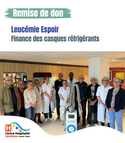 Grâce au généreux don de l’association Leucémie Espoir, partenaire majeur de l’hôpital de Saint-Brieuc depuis plus de 30 ans, le service d’oncologie a pu se doter d’une colonne de casques réfrigérants d’une valeur de 23 500 €.